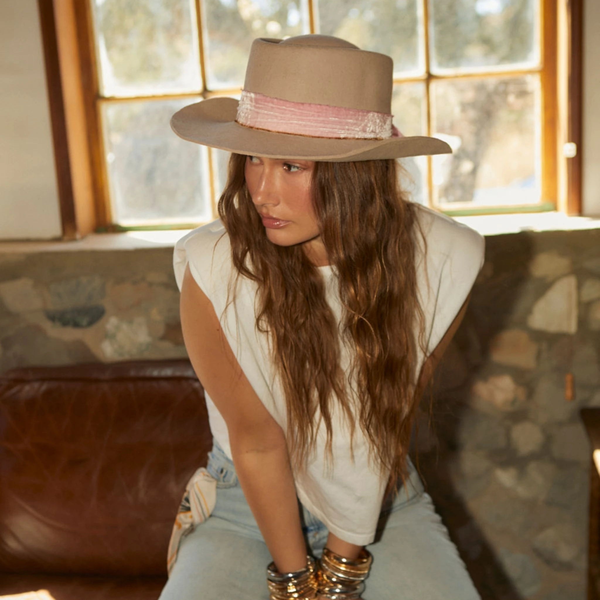 Our Milo wool felt hat, an elegant revisitation of the classic gambler-style hat, combining timeless design with a boho-chic look. Crafted from luxurious wool, this gambler hat features a hand dyed ombre silk velvet band with its torn edges for an elegant and edgy finish touch.